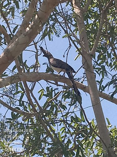 A medium-sized slender bird with a prominent crest, white underside, and a long graduated tail, often seen perched in trees.