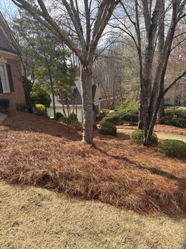 A thick layer of fallen pine needles used as ground cover and mulch in a residential landscape to suppress weeds and retain moisture.
