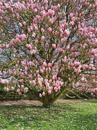 A deciduous tree or large shrub known for its large, saucer-shaped pink and white flowers that bloom in early spring before its leaves emerge.