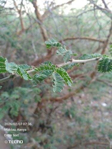 A close-up view of the bipinnate leaves and thorns on a branch of an Acacia tree, a common woody plant characteristic of the African savanna.