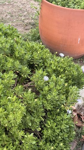 A bushy perennial plant, commonly known as the African Daisy, featuring green foliage and white to light purple daisy-like flowers with blue centers.