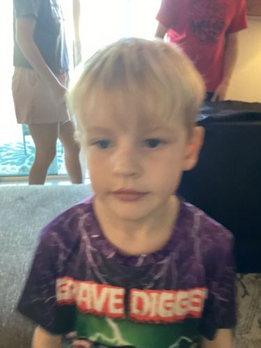A young human male with light-colored hair wearing a purple t-shirt featuring 'Grave Digger' graphics.