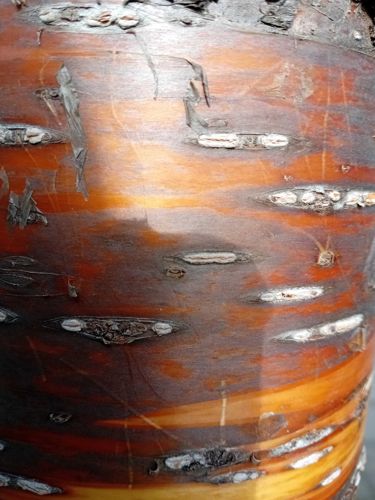A close-up of trunk bark known for its glossy, mahogany-red color and prominent horizontal lenticels that help the tree breathe.