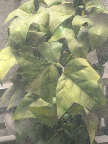 A dusty, artificial decorative plant with evergreen-shaped leaves designed to look like ivy, likely made of fabric or plastic.